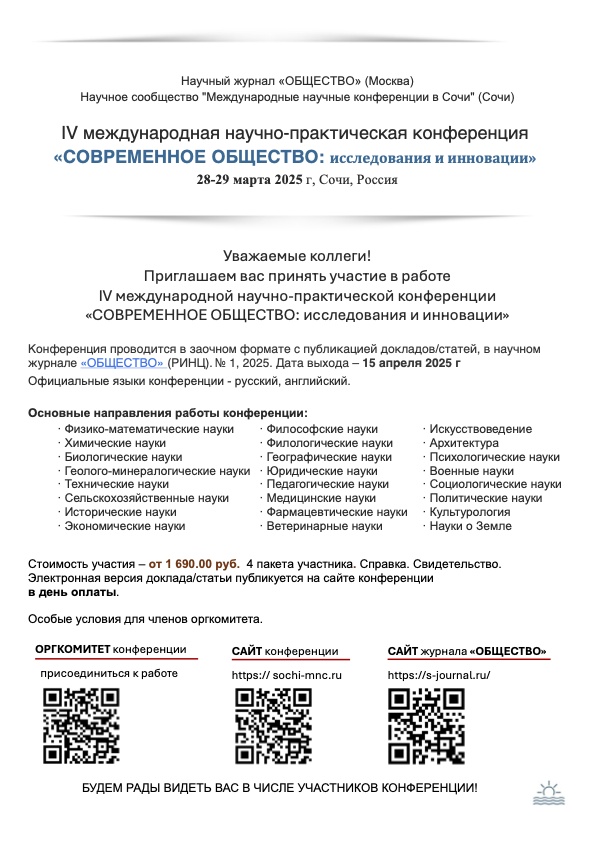Международная научно-практическая конференция «СОВРЕМЕННОЕ ОБЩЕСТВО: исследования и инновации» - одно из мероприятий проекта «Международные научные конференции в Сочи». МНПК «СОВРЕМЕННОЕ ОБЩЕСТВО: исследования и инновации» - это информационное пространство, организуемое с целью представления и обсуждения результатов исследовательской деятельности и внедрения инноваций в кругу научных работников, докторантов, аспирантов и соискателей, магистранов и студентов, работников образовательных и других организаций России и стран зарубежья. Конференция проводится в заочном формате с публикацией докладов/статей в научном журнале «ОБЩЕСТВО» (РИНЦ). Официальные языки конференции - русский, английский. ПРОГРАММА КОНФЕРЕНЦИИОСНОВНЫЕ НАПРАВЛЕНИЯ РАБОТЫ